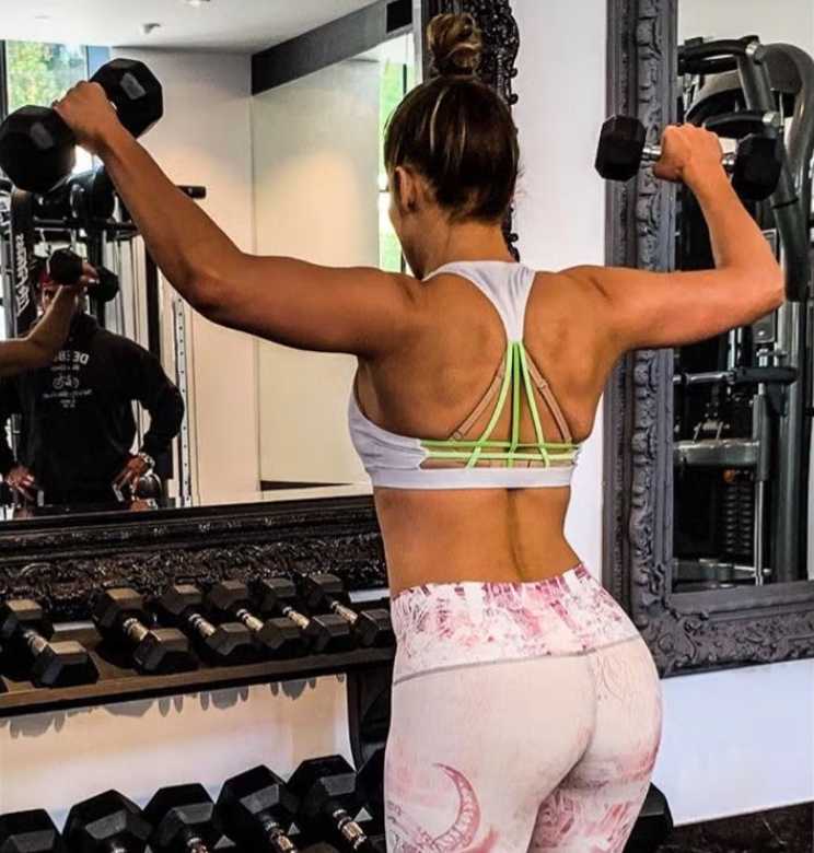 Her dumbbell routines target multiple muscle groups through varied sets and repetitions, ensuring strength, endurance, and tone across the body.