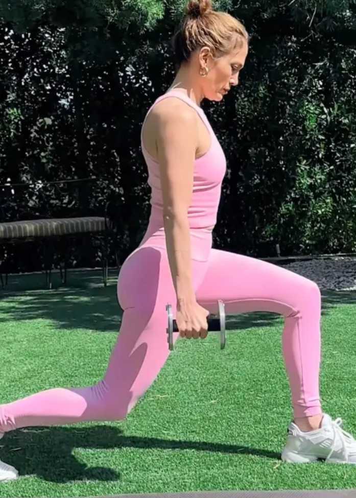 To keep her legs and core strong, Lopez performs dumbbell lunges, squats, and plyometric jumps. These moves improve posture and endurance for her demanding stage routines.